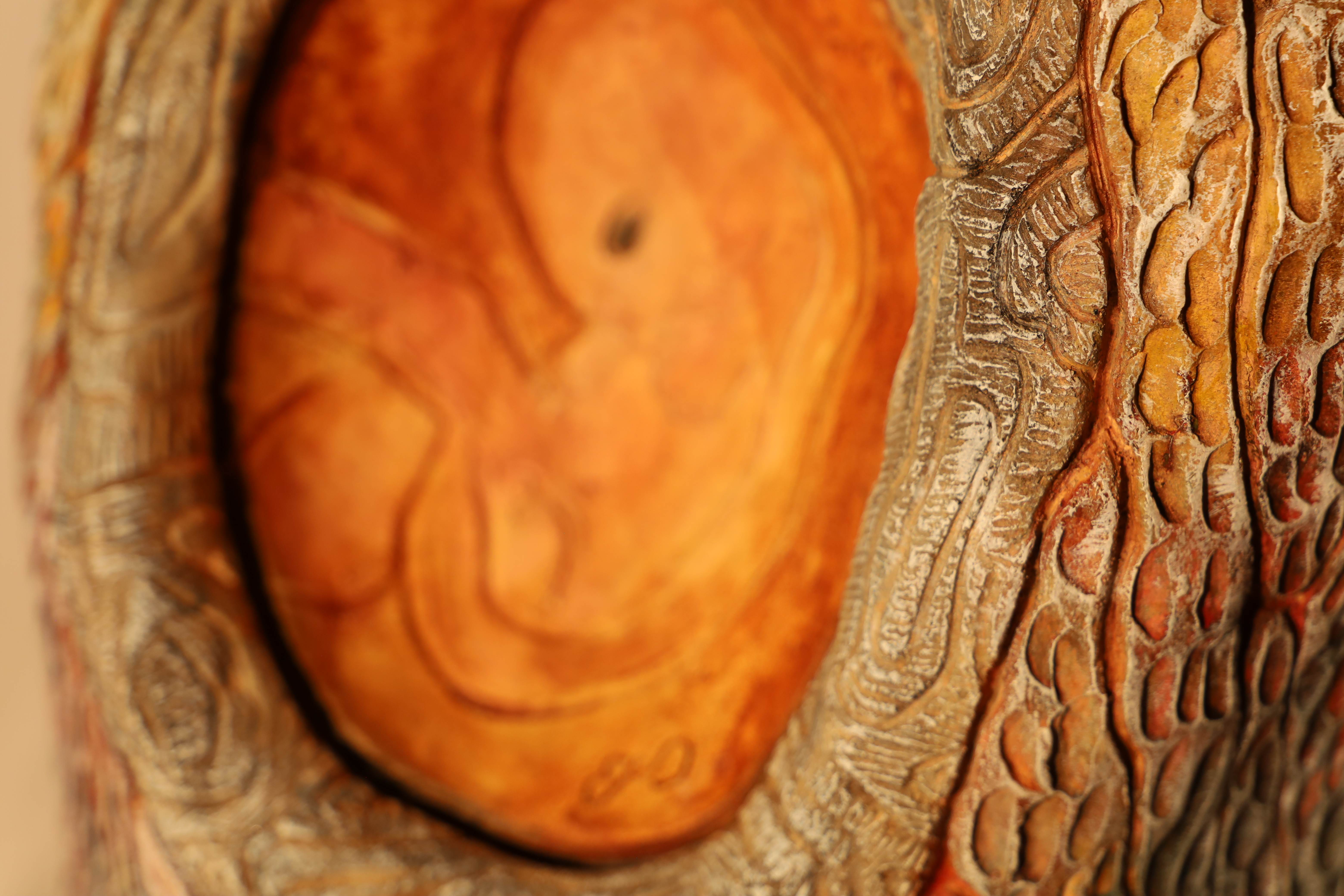 Dayna Ball, Growth, High Fire Death Valley Clay, Acrylic Paint, 16 x 16 x 10 inches, 2022 - 08 Growth discusses the beginning of human life in this most vulnerable in utero stage. Growth discusses how all organisms experience life stages, how intraorganistically, or across species, life is still life. In the case of the human species, life definitively begins at conception, but currently a huge portion of scientific misinformation runs amok. The pro-abortion argument is really not an argument of when human life begins, but rather when it is protected and valued. It is surely alarming how so many individuals are willing to deny science in order to justify actions they wish. While this piece nods to barbaric modern killing practices in utero, Growth really discusses the beginnings of life for us all.