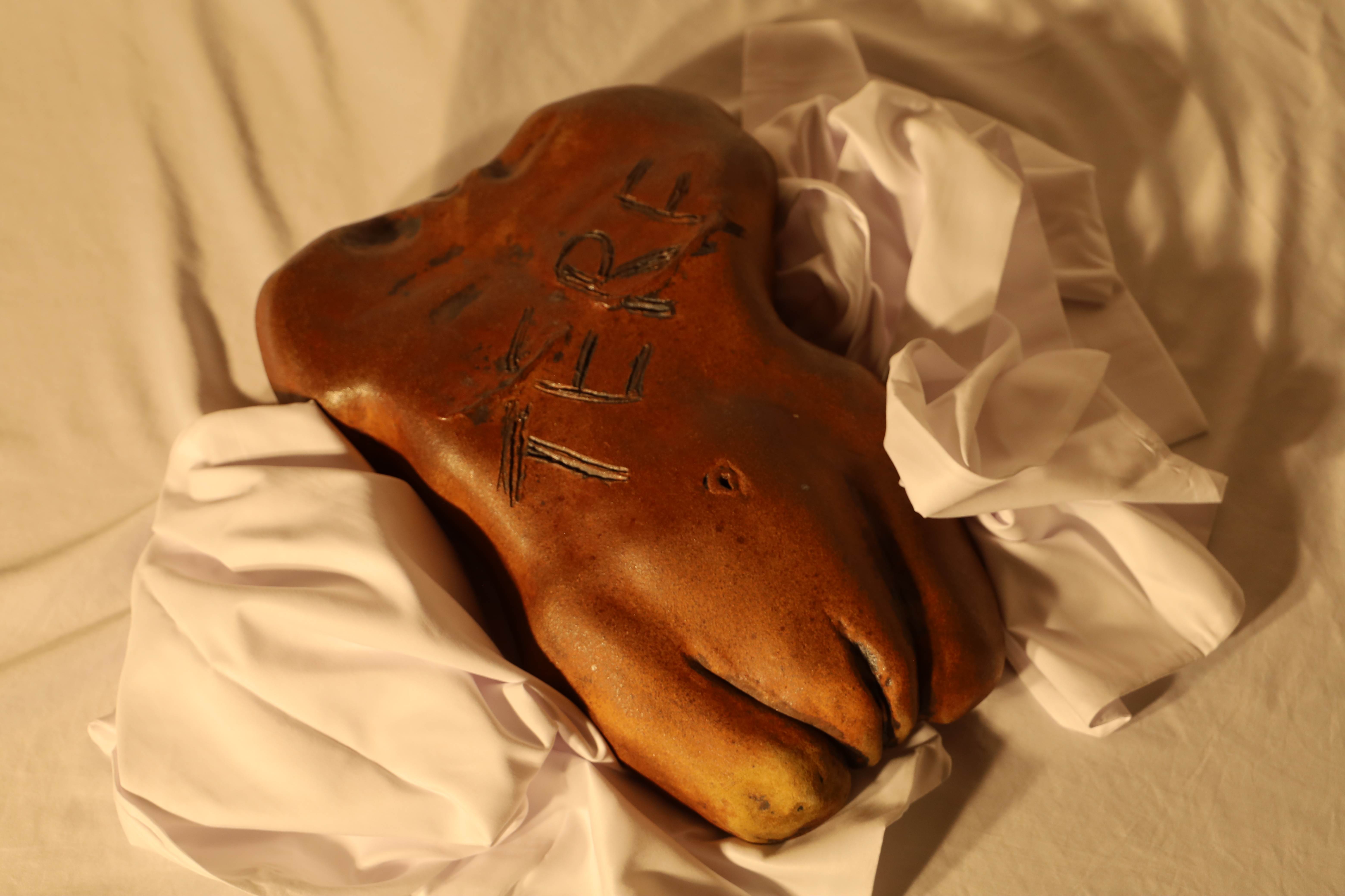 Dayna Ball, TERF, High Fire Death Valley Clay, Stains, Soda Fired, 3.5 x 11 x 15 inches, 2022 - 1 TERF discusses the challenges many women face as they have transpired through an arduous fight with breast cancer only to hear their sense of womanhood questioned on the other side by radical gender activists. Any person who agrees that gender is something you must think or feel is a person who agrees those struggling with gender identity cannot have a firm grasp on that reality. This struggle becomes attacking and a winding maze for many people who experience gender dysphoria, when even those who are supposed to help you serve only to confuse you more deeply.
