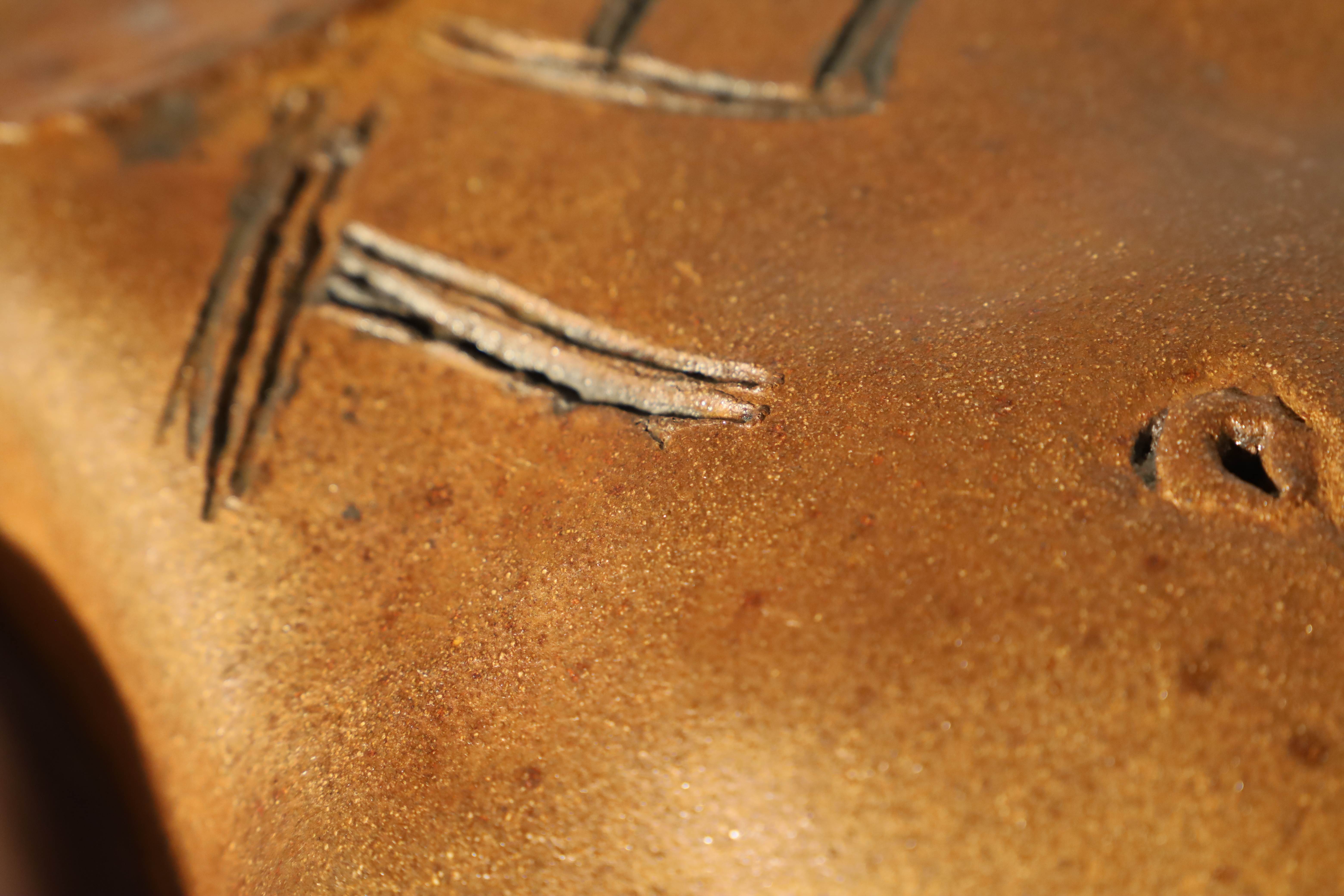 Dayna Ball, TERF, High Fire Death Valley Clay, Stains, Soda Fired, 3.5 x 11 x 15 inches, 2022 - 4 TERF discusses the challenges many women face as they have transpired through an arduous fight with breast cancer only to hear their sense of womanhood questioned on the other side by radical gender activists. Any person who agrees that gender is something you must think or feel is a person who agrees those struggling with gender identity cannot have a firm grasp on that reality. This struggle becomes attacking and a winding maze for many people who experience gender dysphoria, when even those who are supposed to help you serve only to confuse you more deeply.