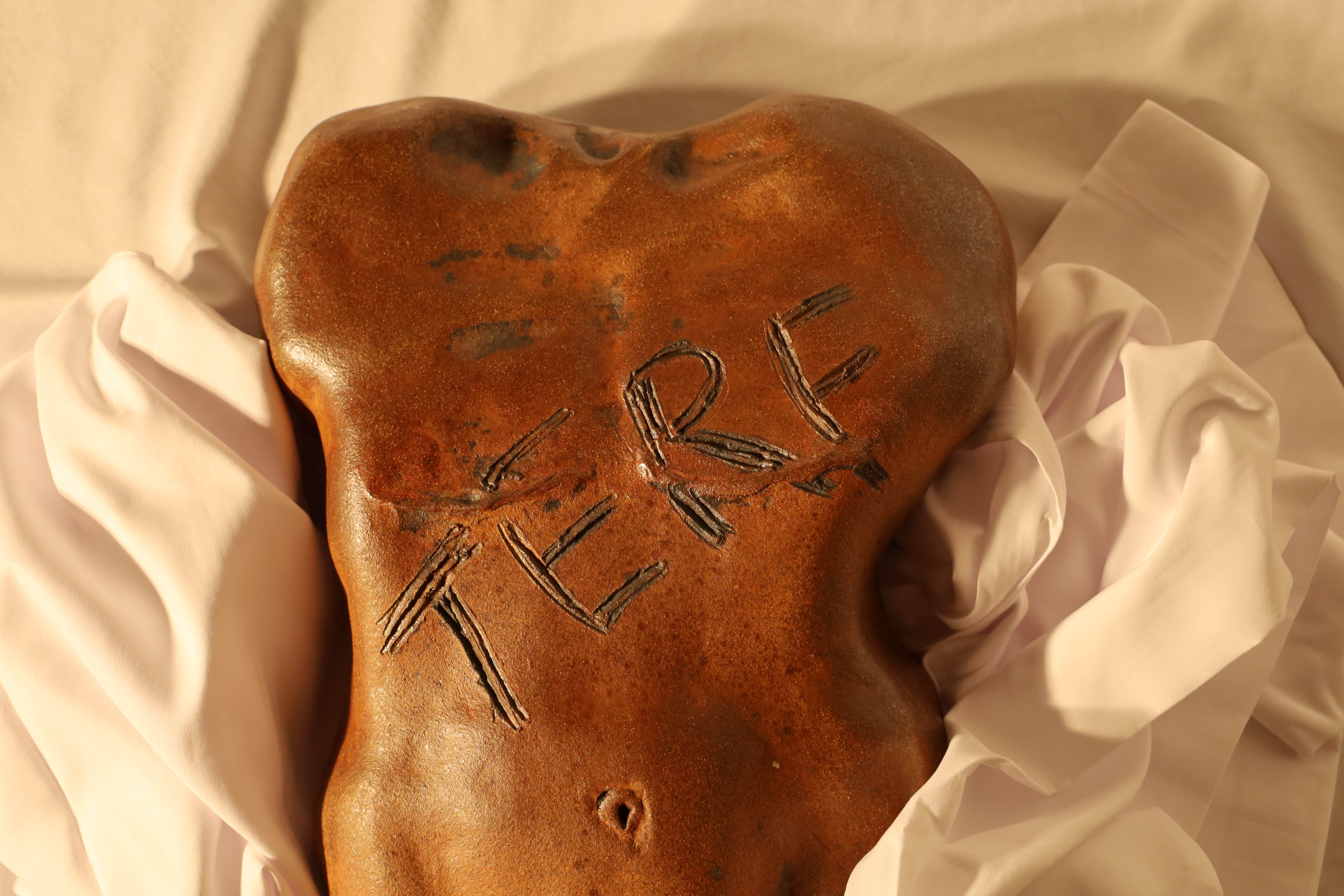 Dayna Ball, TERF, High Fire Death Valley Clay, Stains, Soda Fired, 3.5 x 11 x 15 inches, 2022 - 6 TERF discusses the challenges many women face as they have transpired through an arduous fight with breast cancer only to hear their sense of womanhood questioned on the other side by radical gender activists. Any person who agrees that gender is something you must think or feel is a person who agrees those struggling with gender identity cannot have a firm grasp on that reality. This struggle becomes attacking and a winding maze for many people who experience gender dysphoria, when even those who are supposed to help you serve only to confuse you more deeply.