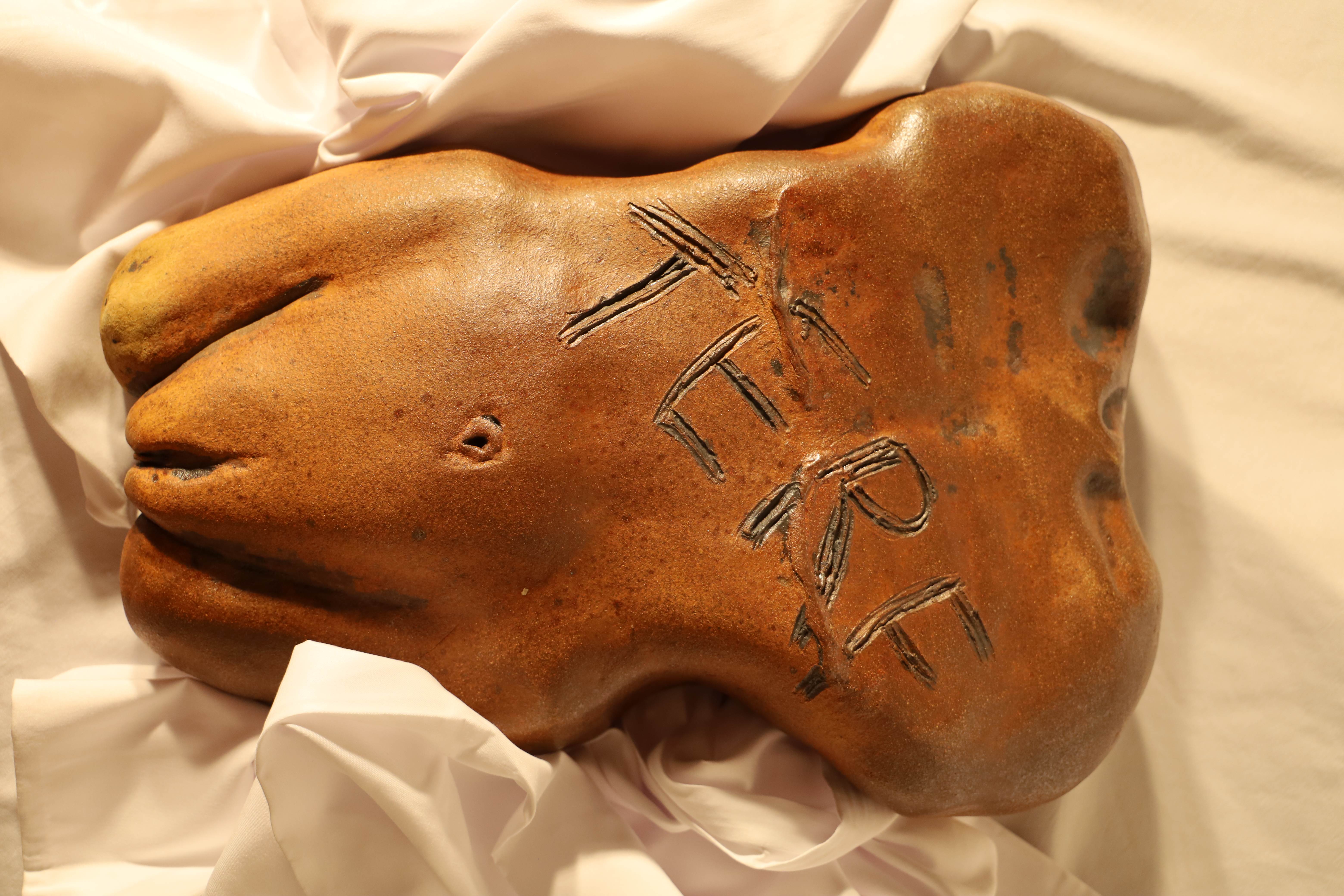 Dayna Ball, TERF, High Fire Death Valley Clay, Stains, Soda Fired, 3.5 x 11 x 15 inches, 2022 - 7 TERF discusses the challenges many women face as they have transpired through an arduous fight with breast cancer only to hear their sense of womanhood questioned on the other side by radical gender activists. Any person who agrees that gender is something you must think or feel is a person who agrees those struggling with gender identity cannot have a firm grasp on that reality. This struggle becomes attacking and a winding maze for many people who experience gender dysphoria, when even those who are supposed to help you serve only to confuse you more deeply.