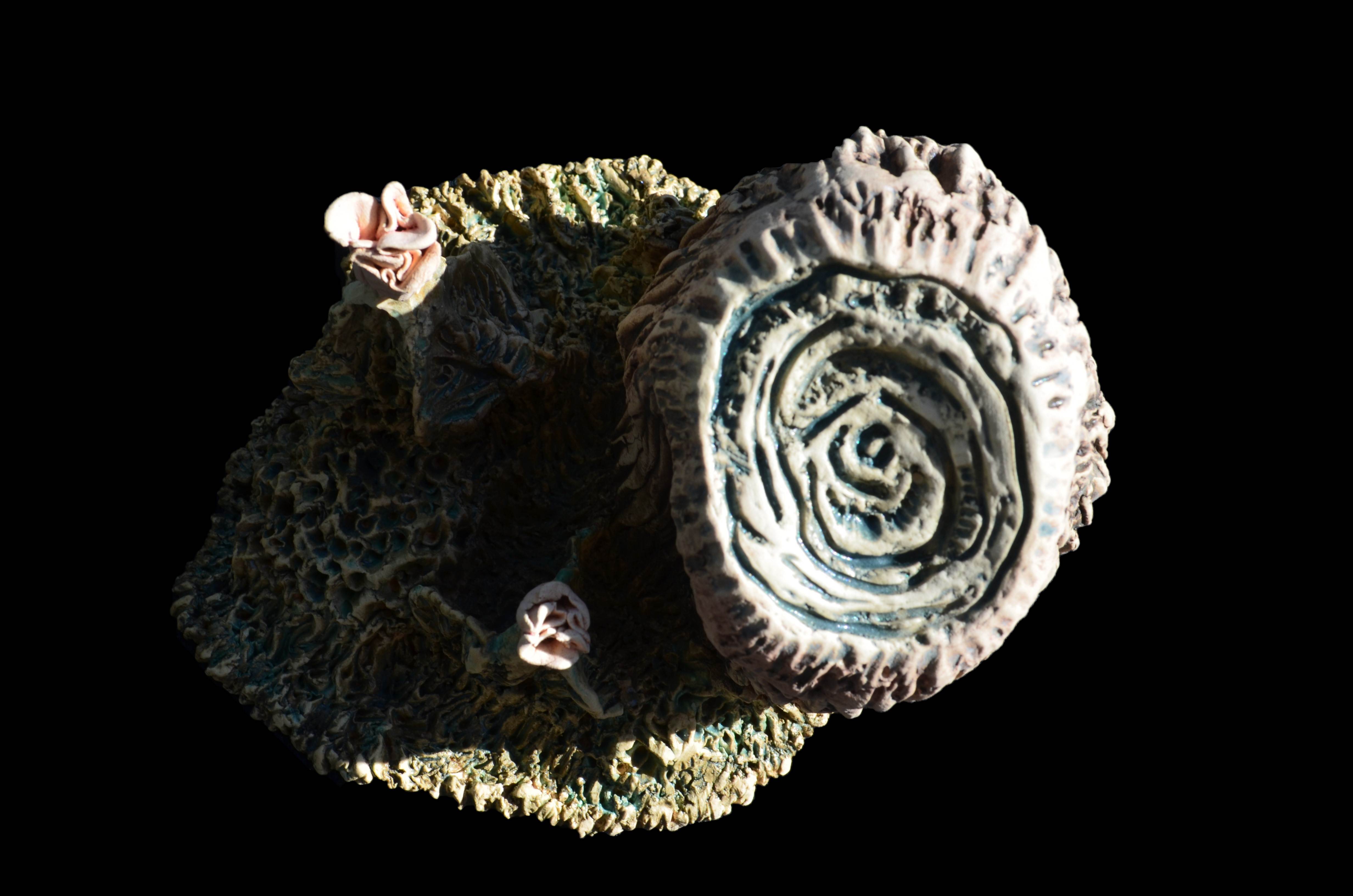 Dayna Ball, Tree Series, 2023 - 03_01 These tree series explore articulation of nature in clay. This pursuit is approached in terms of hand-built forms, meticulous incision of texture on surface, and color approach through mason stain discovery. This work seeks to explore the articulation of nature and environment as it relates to the artist, with heavy attention paid to past intellectual work in two-dimensional rendering of natural forms, with perception and idealization of nature playing a large role in that process.