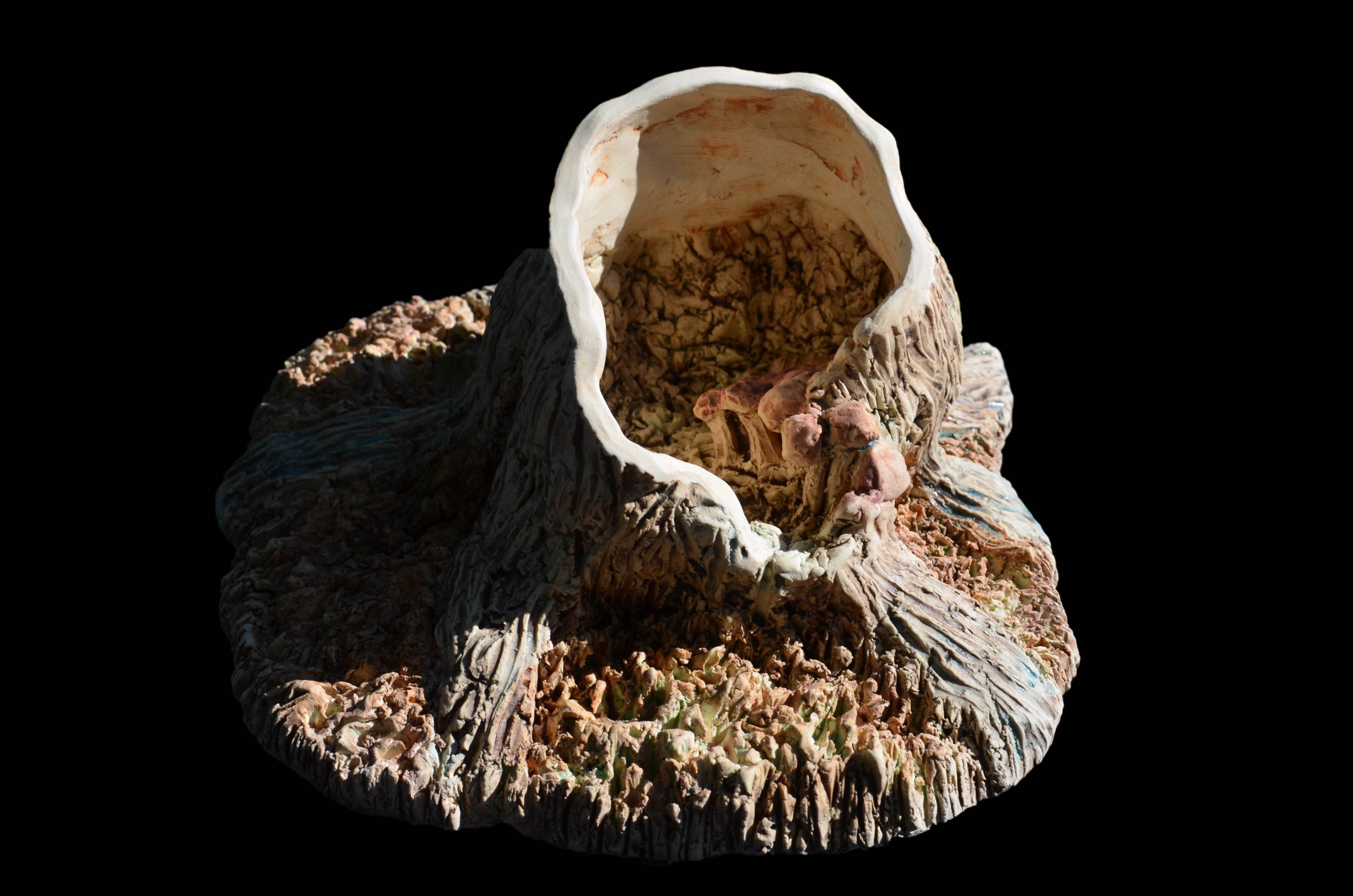 Dayna Ball, Tree Series, 2023 - 04_02 These tree series explore articulation of nature in clay. This pursuit is approached in terms of hand-built forms, meticulous incision of texture on surface, and color approach through mason stain discovery. This work seeks to explore the articulation of nature and environment as it relates to the artist, with heavy attention paid to past intellectual work in two-dimensional rendering of natural forms, with perception and idealization of nature playing a large role in that process.