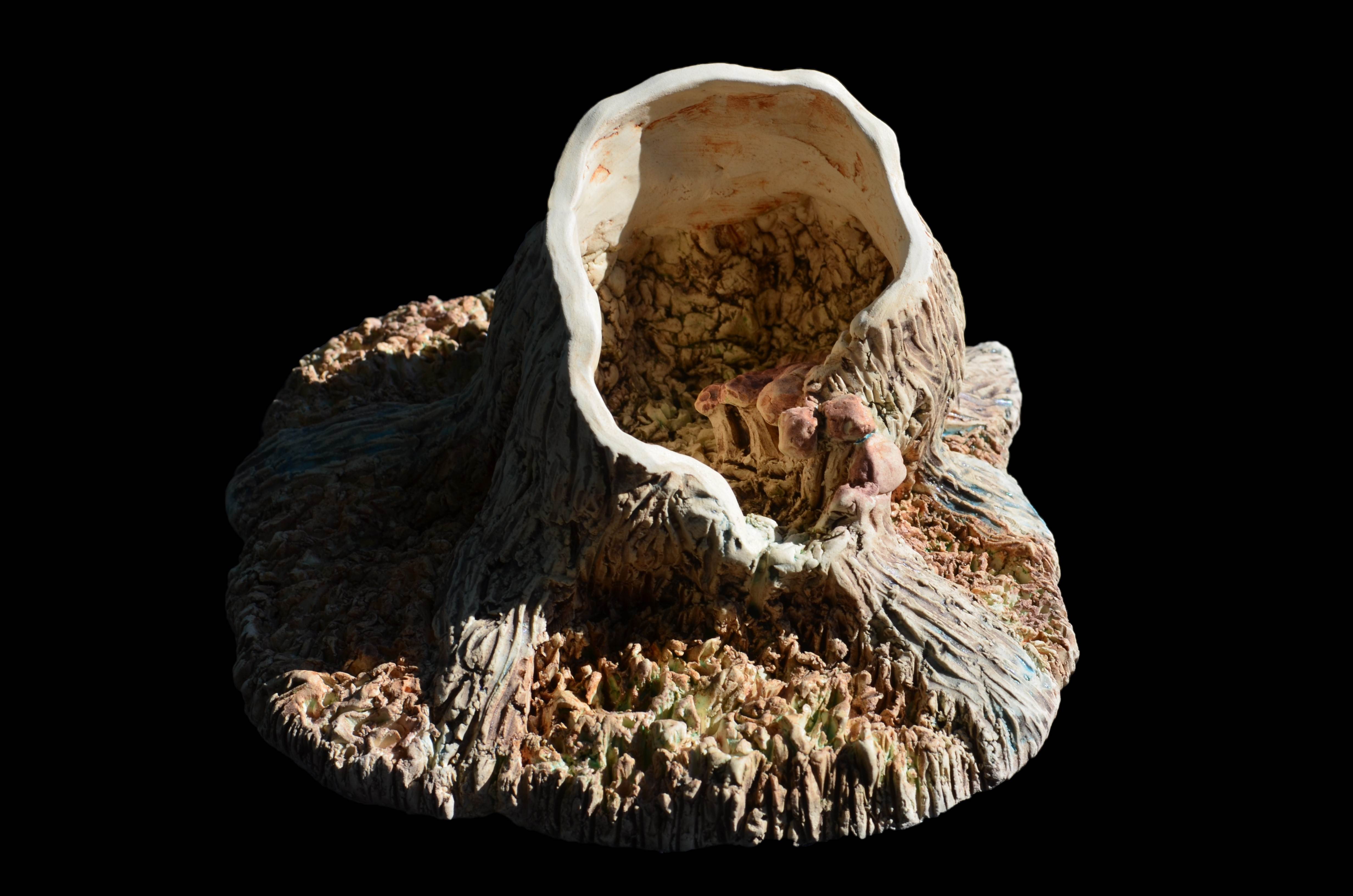 Dayna Ball, Tree Series, 2023 - 04_06 These tree series explore articulation of nature in clay. This pursuit is approached in terms of hand-built forms, meticulous incision of texture on surface, and color approach through mason stain discovery. This work seeks to explore the articulation of nature and environment as it relates to the artist, with heavy attention paid to past intellectual work in two-dimensional rendering of natural forms, with perception and idealization of nature playing a large role in that process.