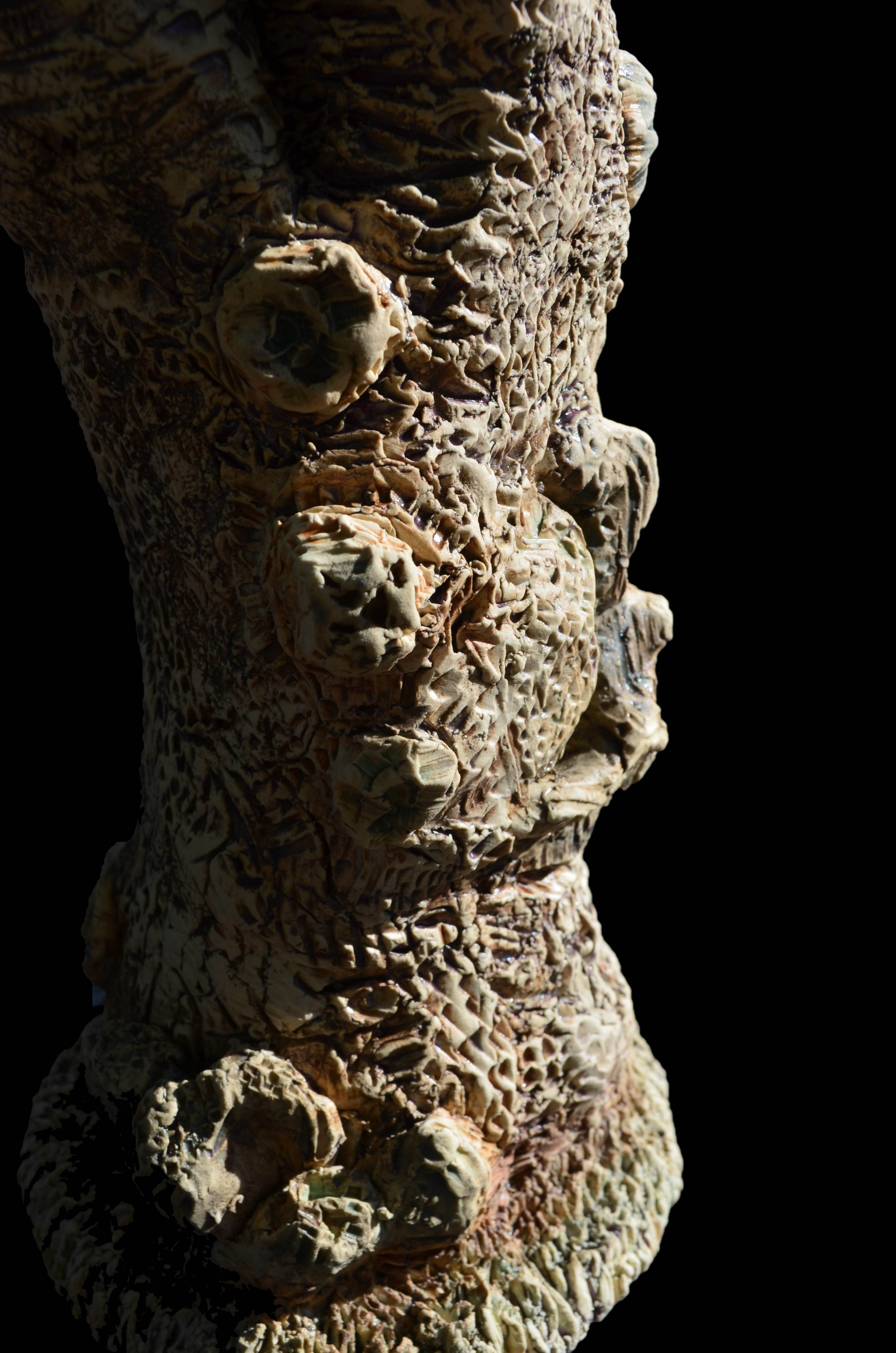 Dayna Ball, Tree Series, 2023 - 06_03 These tree series explore articulation of nature in clay. This pursuit is approached in terms of hand-built forms, meticulous incision of texture on surface, and color approach through mason stain discovery. This work seeks to explore the articulation of nature and environment as it relates to the artist, with heavy attention paid to past intellectual work in two-dimensional rendering of natural forms, with perception and idealization of nature playing a large role in that process.