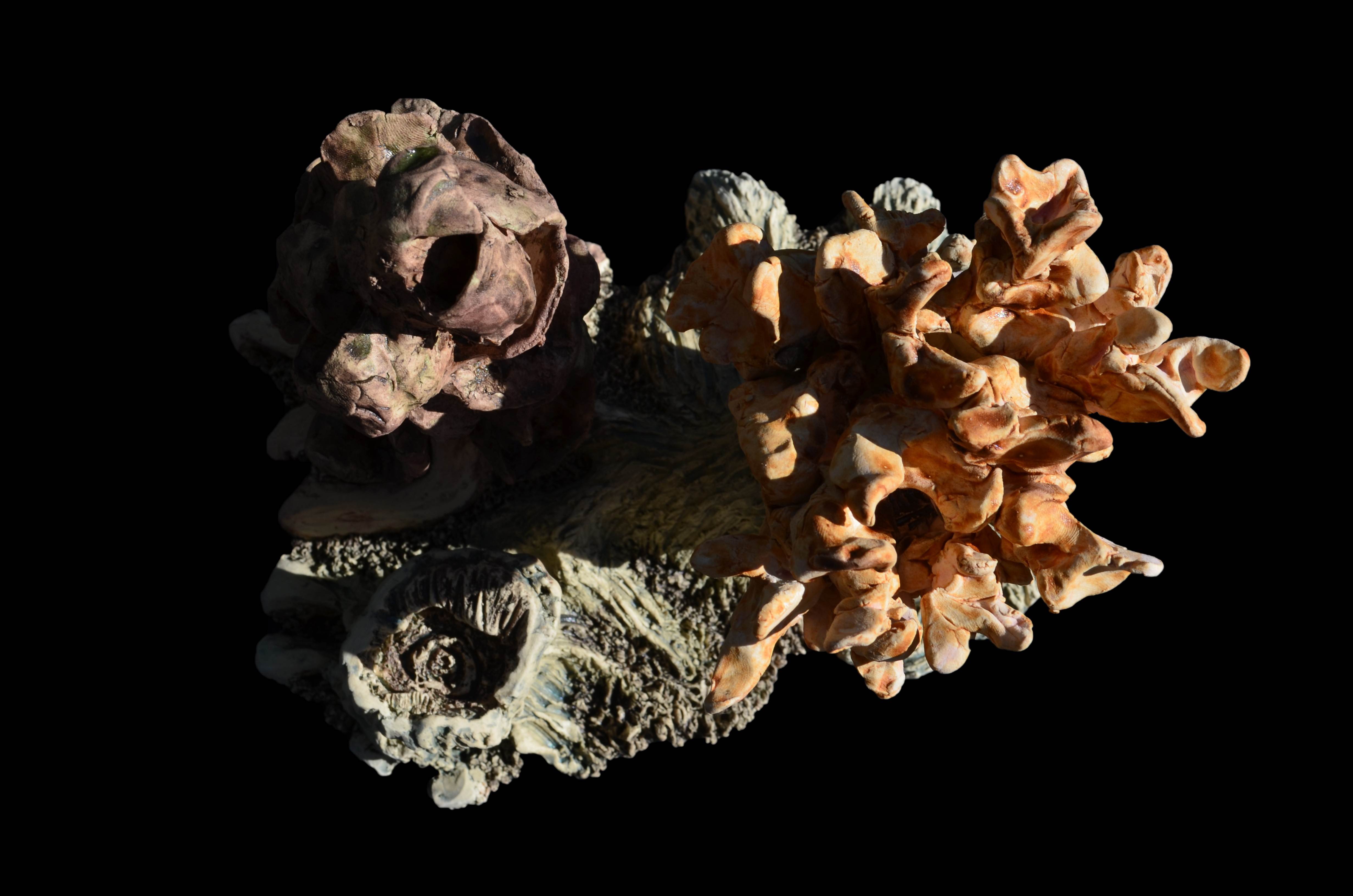 Dayna Ball, Tree Series, 2023 - 08_06 These tree series explore articulation of nature in clay. This pursuit is approached in terms of hand-built forms, meticulous incision of texture on surface, and color approach through mason stain discovery. This work seeks to explore the articulation of nature and environment as it relates to the artist, with heavy attention paid to past intellectual work in two-dimensional rendering of natural forms, with perception and idealization of nature playing a large role in that process.