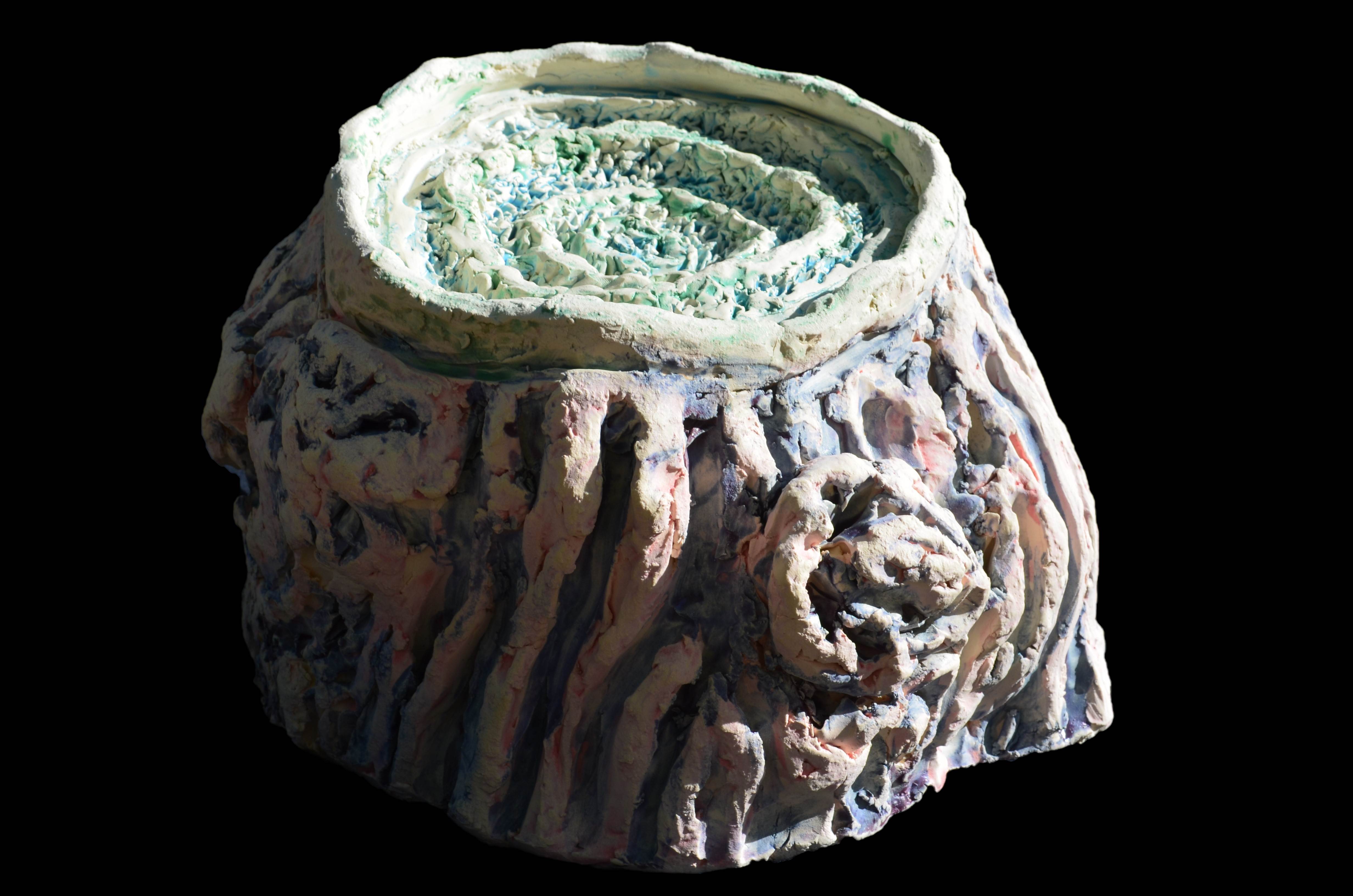 Dayna Ball, Tree Series, 2023 - 10_02 These tree series explore articulation of nature in clay. This pursuit is approached in terms of hand-built forms, meticulous incision of texture on surface, and color approach through mason stain discovery. This work seeks to explore the articulation of nature and environment as it relates to the artist, with heavy attention paid to past intellectual work in two-dimensional rendering of natural forms, with perception and idealization of nature playing a large role in that process.
